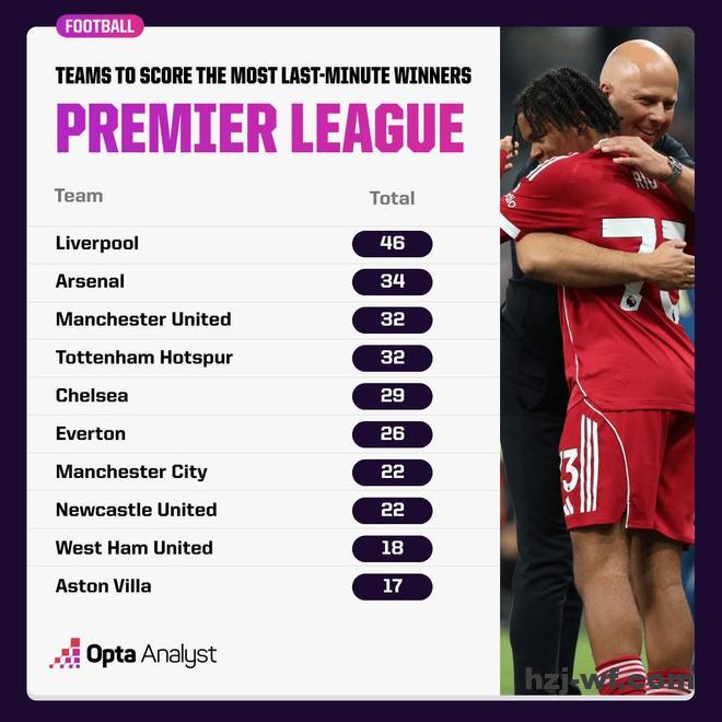 北京时间8月27日,数据机构Opta公布了一项统计数据:自英超创立以来,利物浦共打进46粒读秒绝杀进球,位列英超历史第一。