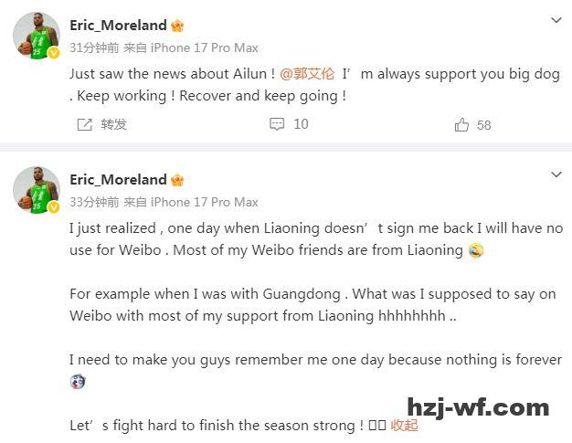 莫兰德还继续谈到自己本赛季重返辽宁男篮效力的感受:“我突然意识到,如果有一天辽宁男篮不再与我续约,我的微博可能就没什么用。我的大多数微博好友都来自辽宁,比如我在广东男篮效力时,面对大部分支持我的辽宁球迷,我在微博上该说什么?我需要让你们记住我,因为没有什么是永恒的。让我们一起努力,争取在赛季结束时取得好成绩!”