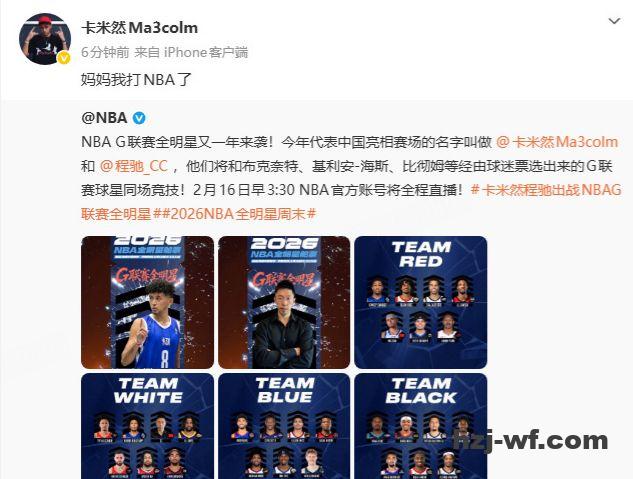 卡米然确认入选2026NBA发展联盟全明星赛的红队阵容,他与程驰成为本届赛事唯二的中国球员,比赛将于北京时间2月16日3点30在洛杉矶举办。